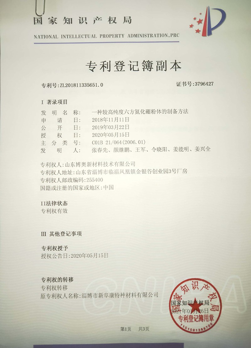 氮化硼氮化鋁復合粉體制備方法發(fā)明專利證書